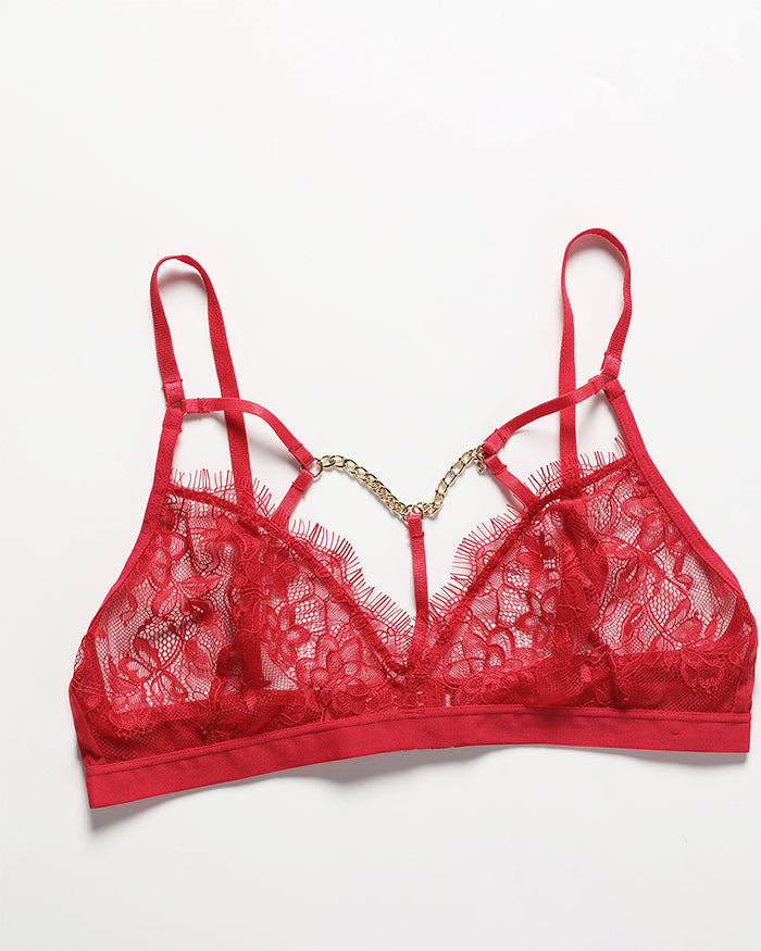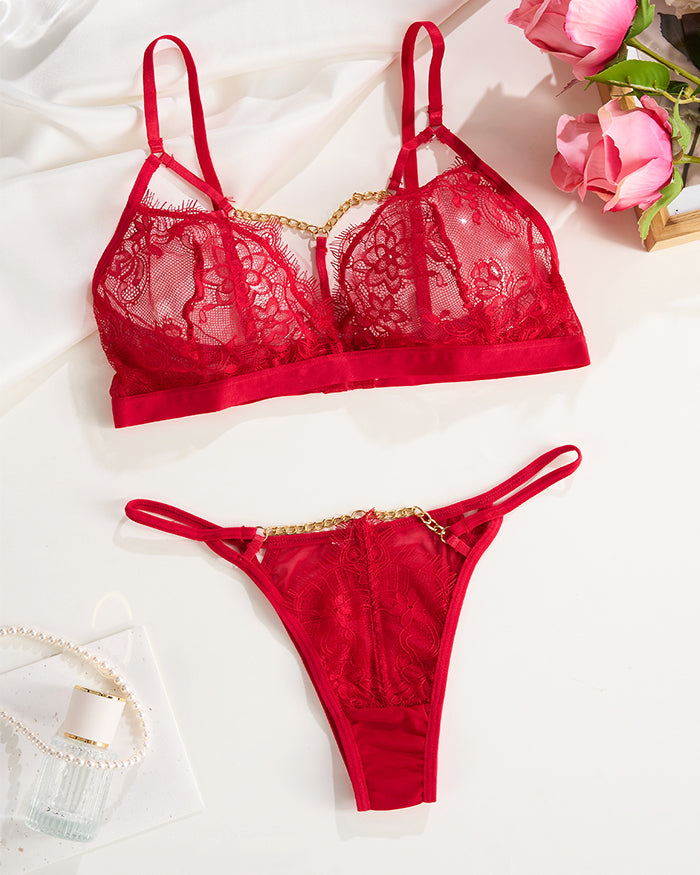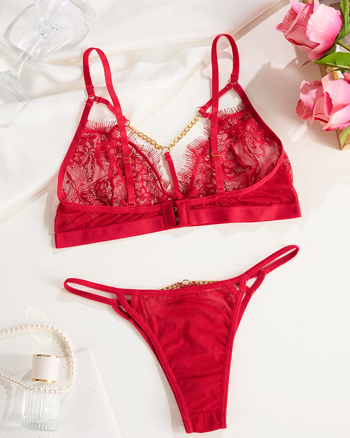 Command every gaze in this Bordeaux lace set, where French leavers lace traces your curves like liquid poetry. The 18K-gilded chain resting atop the cups isn't just adornment—it’s your silent declaration of power, perfectly contrasting the whisper-sheer mesh that teases just enough to ignite imagination.