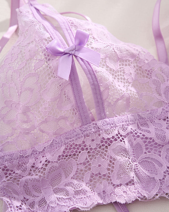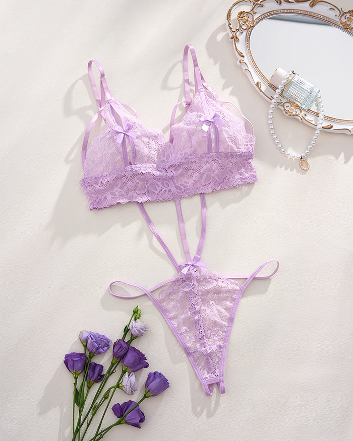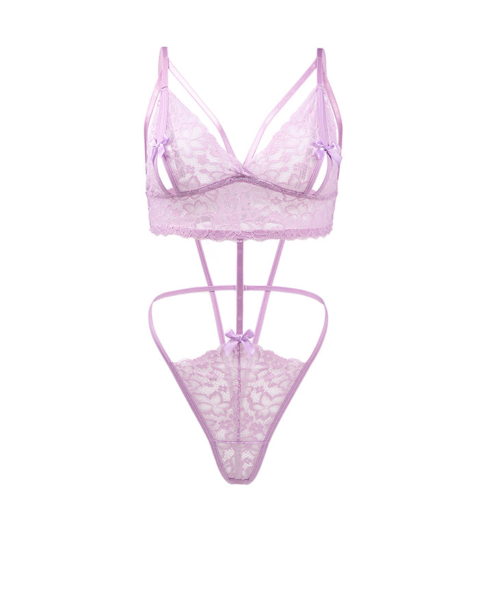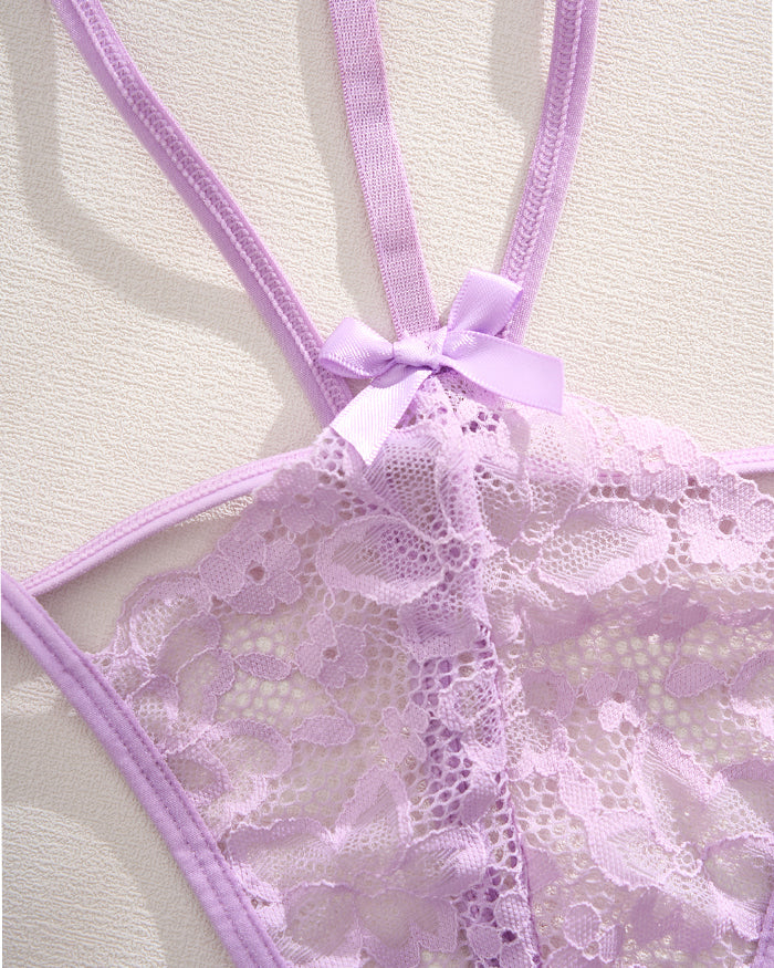 Drench yourself in the soft allure of this lavender lace teddy, where vintage-inspired lace meets modern seduction. Delicate straps crisscross your back like a lover's whisper, while satin-tipped bows at the center bust and hip add a playful flourish—because confidence should always come with a touch of whimsy.