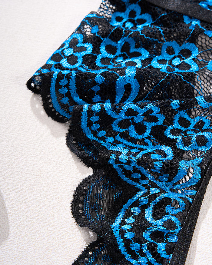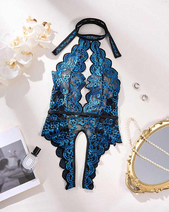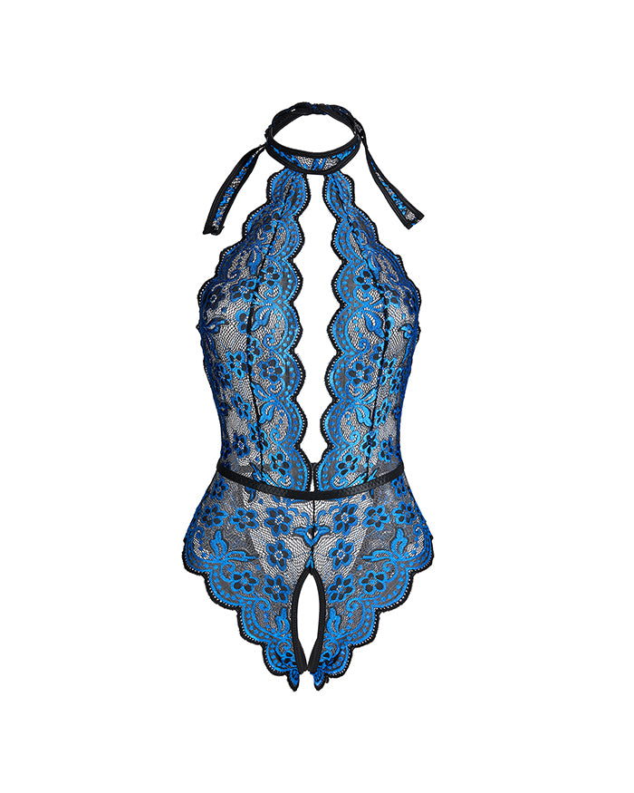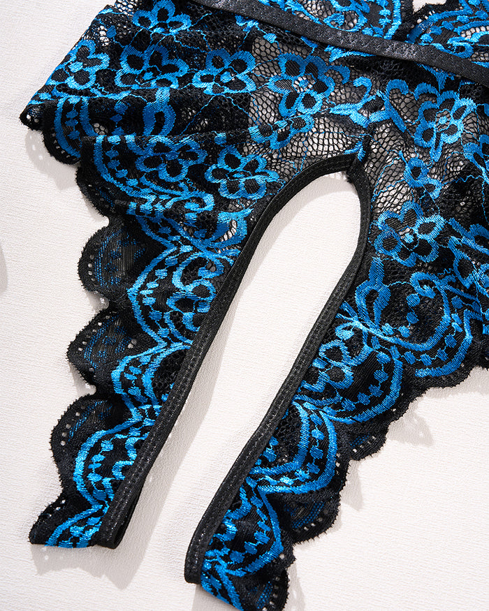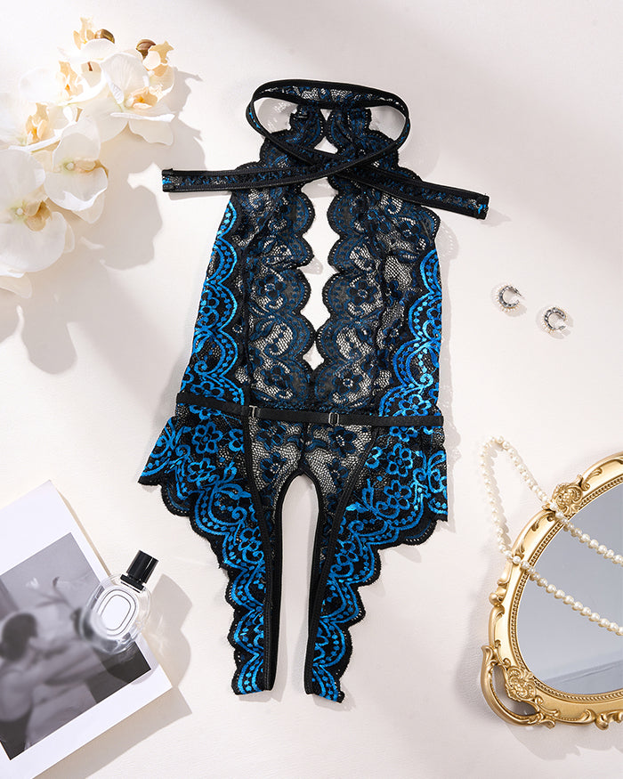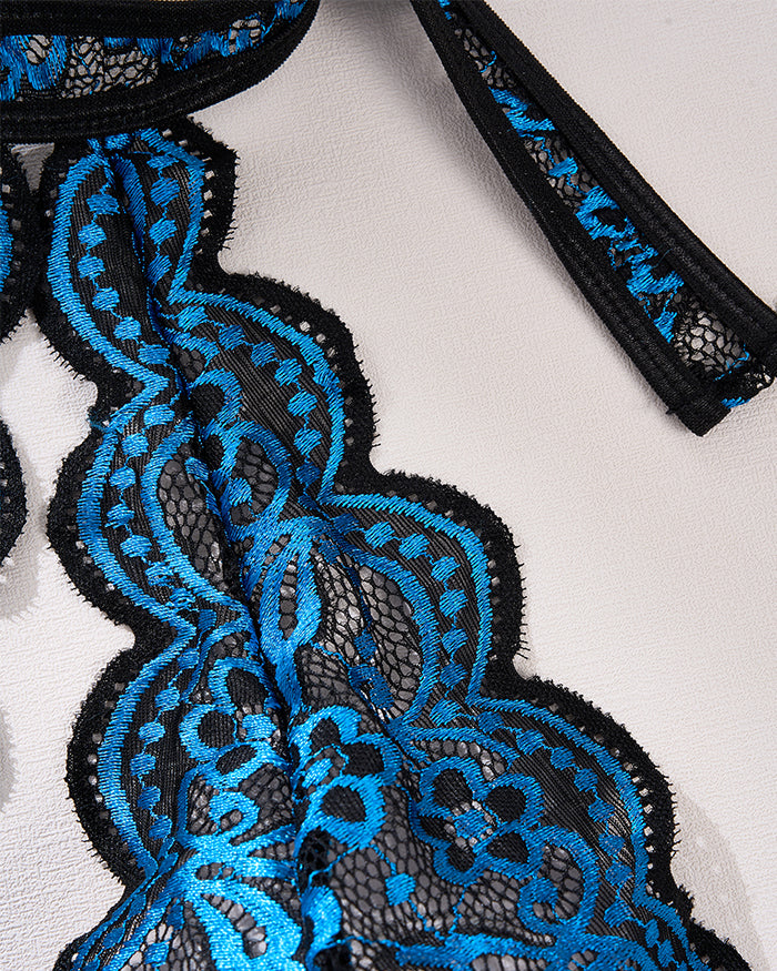 Command the spotlight in this midnight blue lace teddy, where French Chantilly lace cascades over sheer black mesh like starlight on velvet. The built-in choker neckline frames your collarbones with delicate power, while deep V-cut panels trace your curves with feather-light precision—proving true seduction lies in the art of revelation, not exposure.