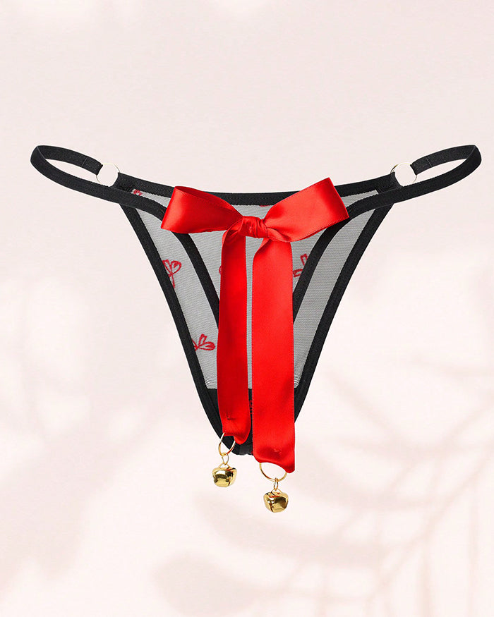 Embrace playful seduction in this sheer mesh G-string, designed for confidence and allure. The delicate black mesh base is adorned with bold red bow prints and accented with shimmering gold bells for a touch of tactile charm. Ultra-thin straps and a minimalist back ensure a seamless, no-show fit under clothing, while the lightweight fabric offers breathable comfort. Whether for intimate moments or adding a secret spark to your day, this G-string combines flirtatious design with effortless wear.