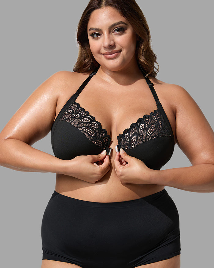The Lace Front Closure Halter Plus Size Bra is designed to provide a flattering fit while ensuring maximum comfort throughout the day. Made from high-quality fabric, this bra features a delicate lace design and a convenient front closure that makes it easy to wear. The halter style offers additional support, making it a perfect choice for any outfit.