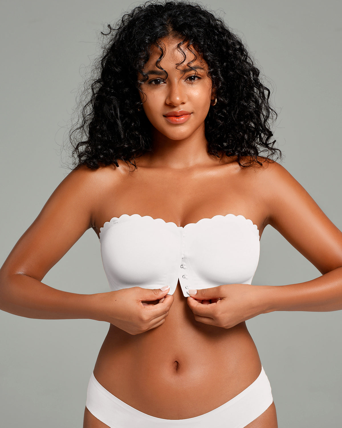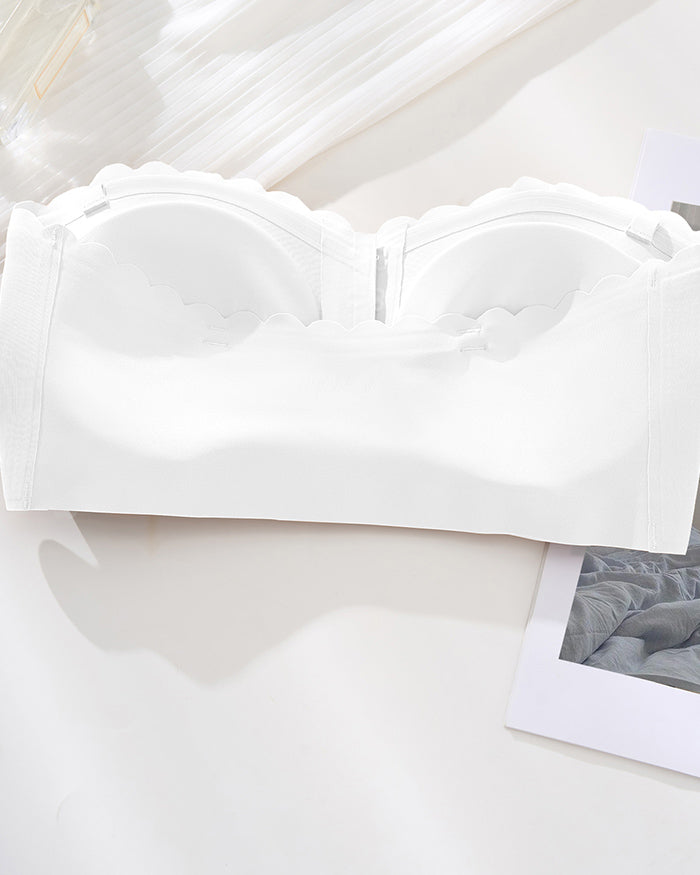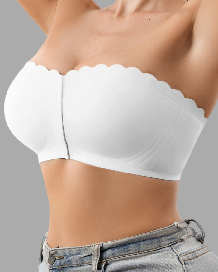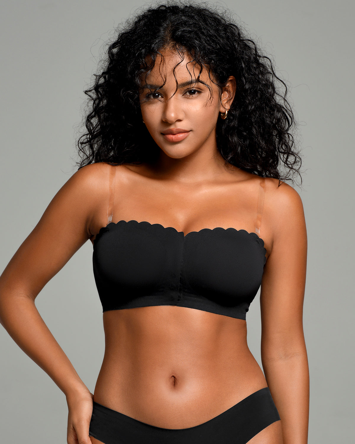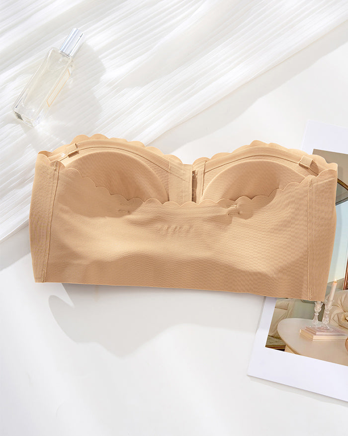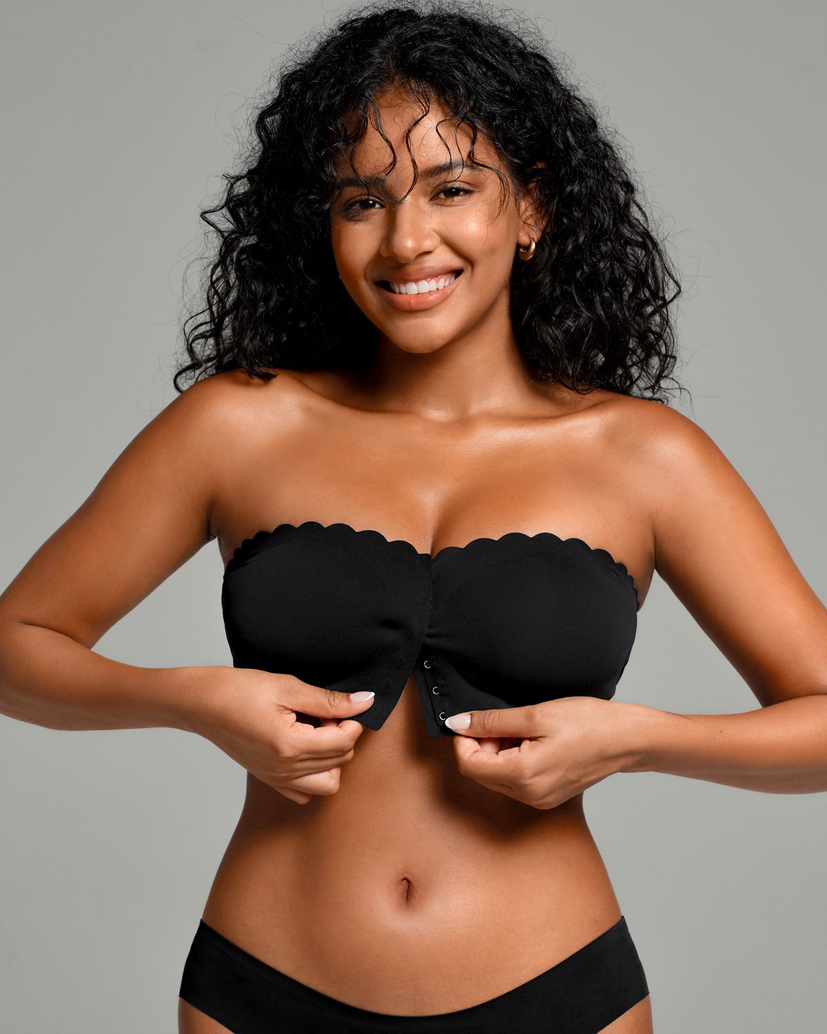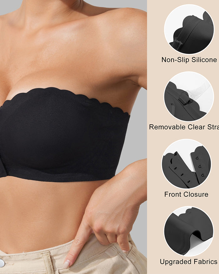 This bra features a convenient front closure for a hassle-free fit that reduces back strain. A non-slip silicone band ensures it stays securely in place. The wavy trim and strapless design beautifully showcase your shoulders and collarbones, making it stunningly sexy and appealing!
