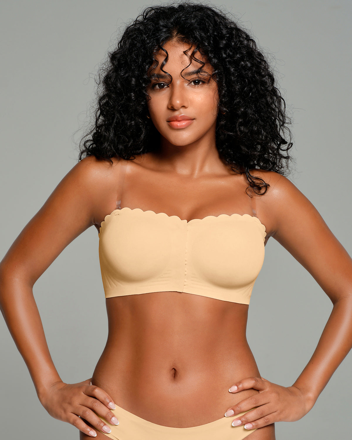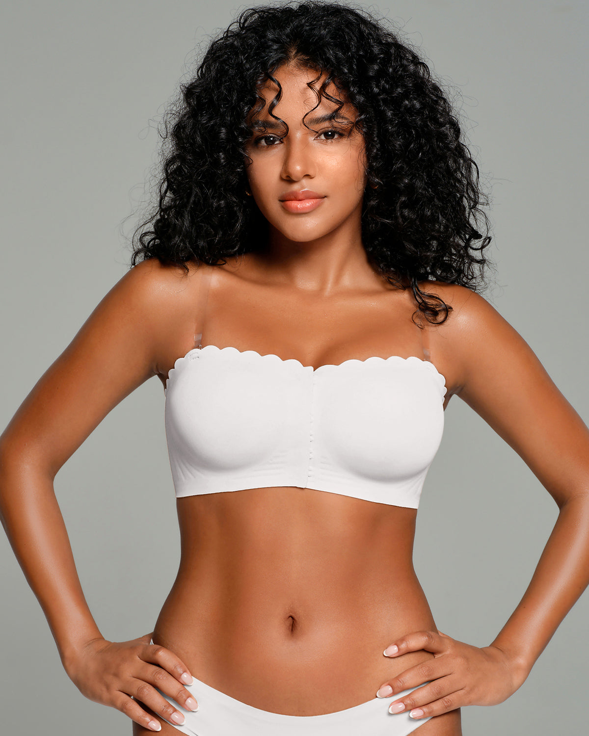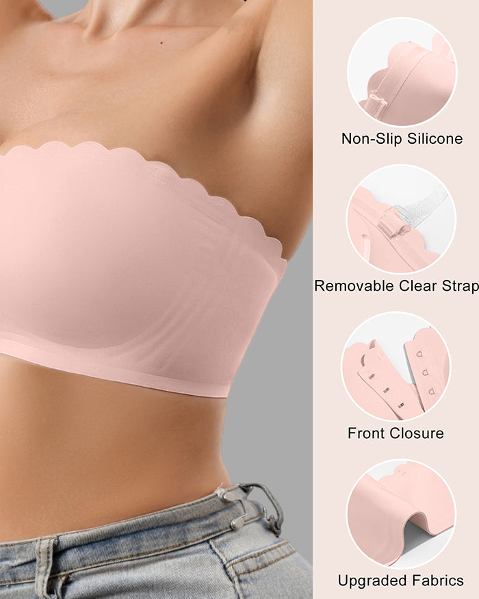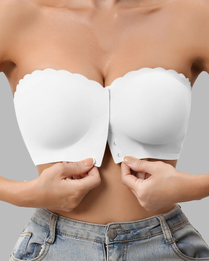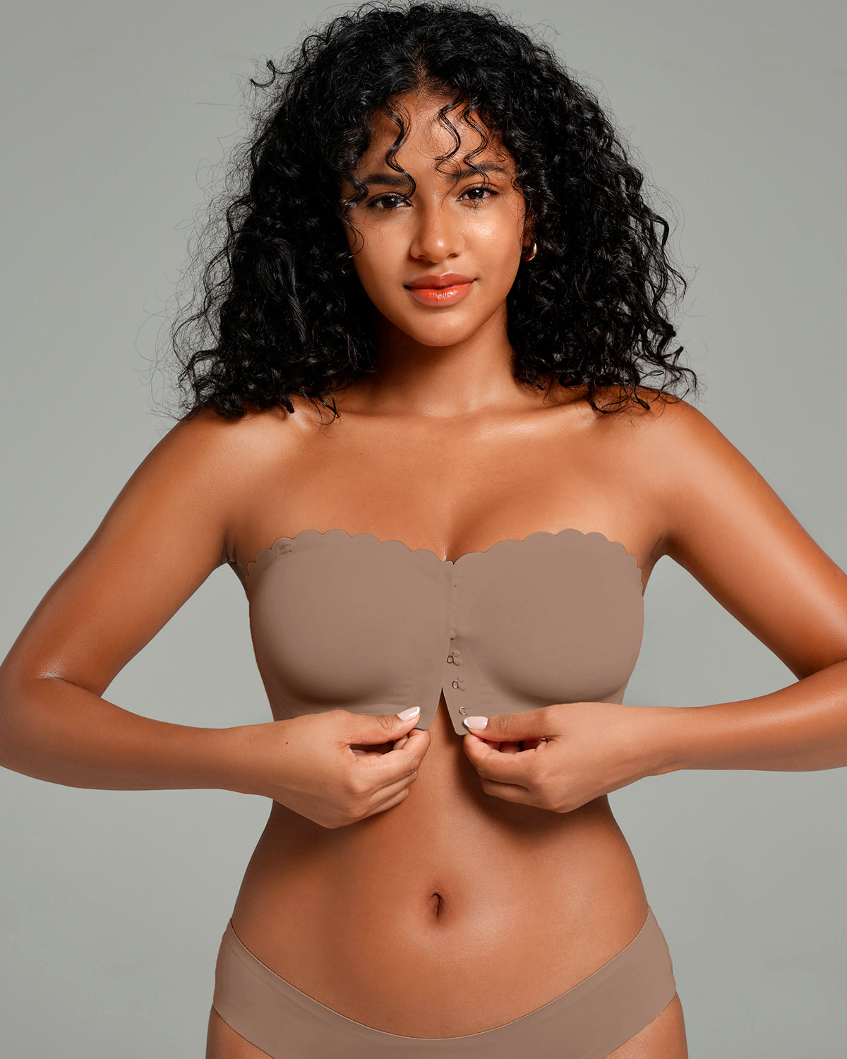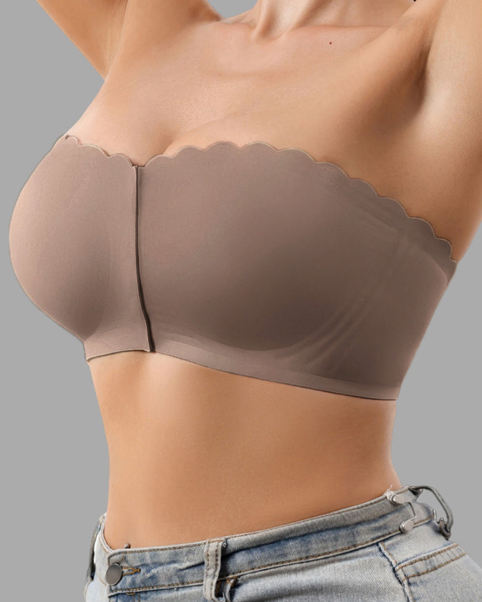 This bra features a convenient front closure for a hassle-free fit that reduces back strain. A non-slip silicone band ensures it stays securely in place. The wavy trim and strapless design beautifully showcase your shoulders and collarbones, making it stunningly sexy and appealing!