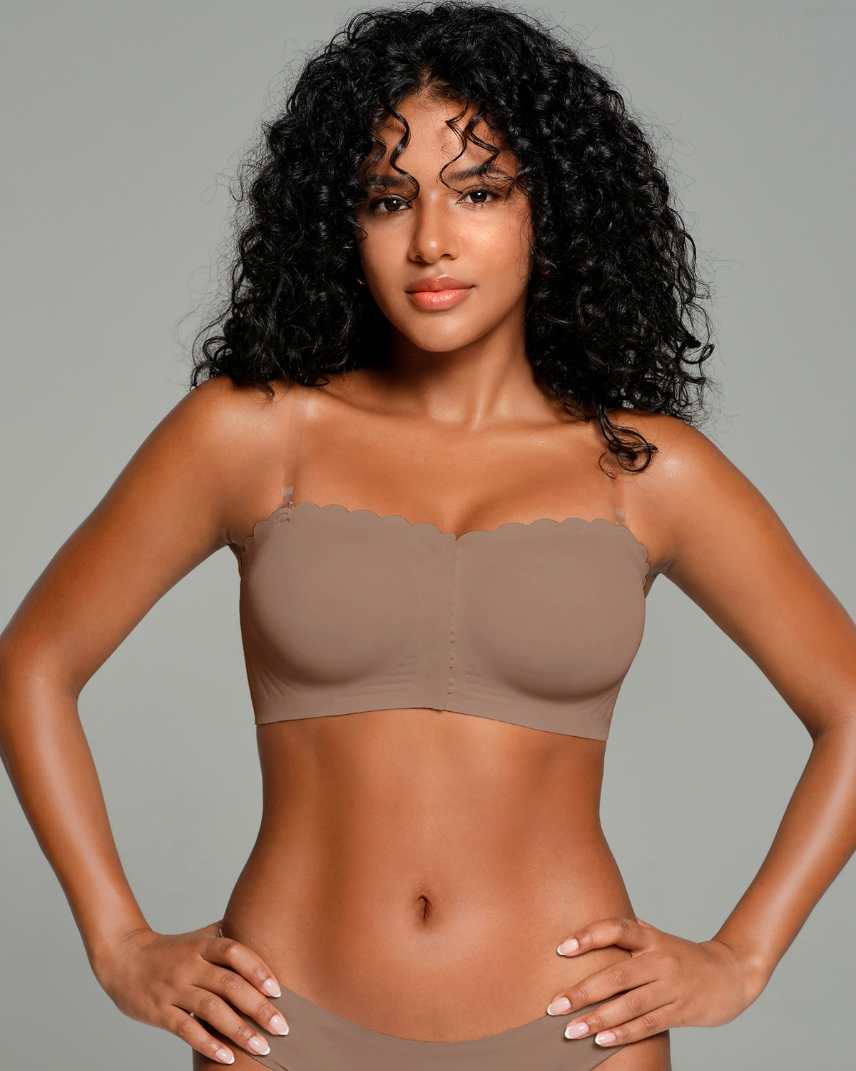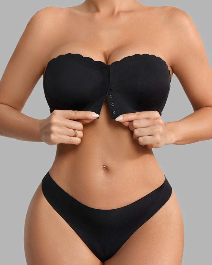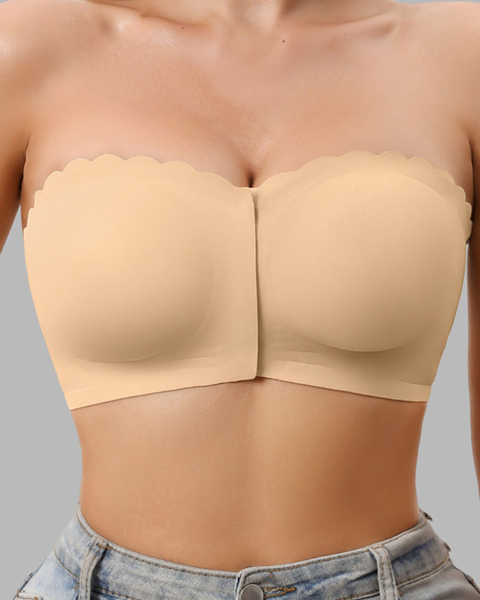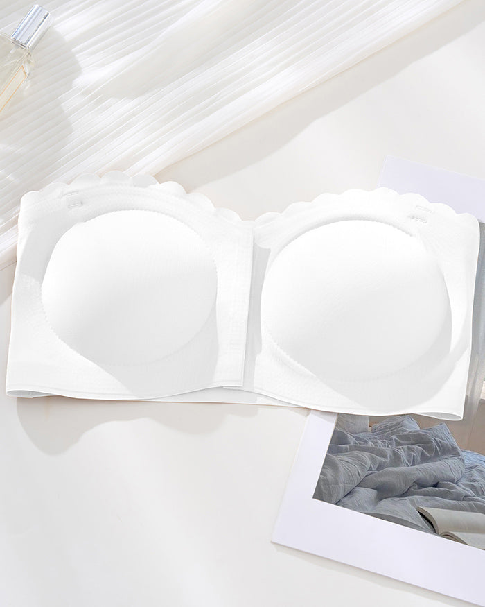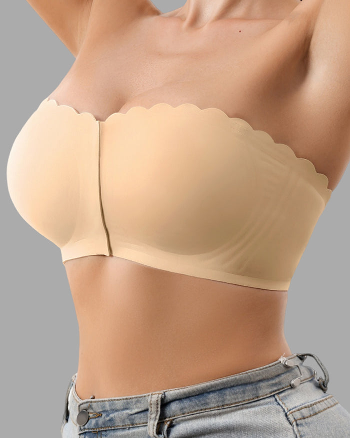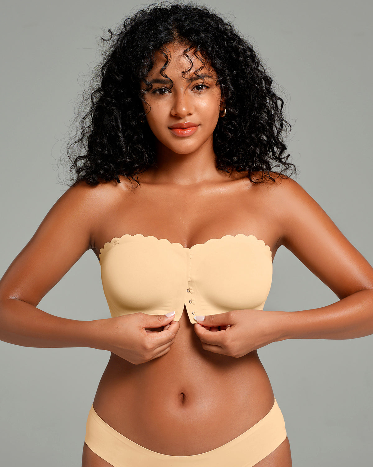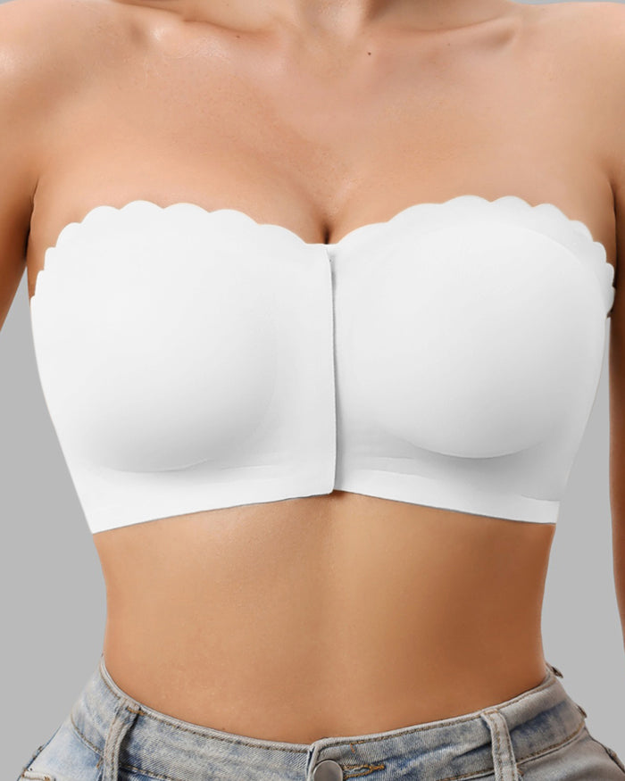 This bra features a convenient front closure for a hassle-free fit that reduces back strain. A non-slip silicone band ensures it stays securely in place. The wavy trim and strapless design beautifully showcase your shoulders and collarbones, making it stunningly sexy and appealing!