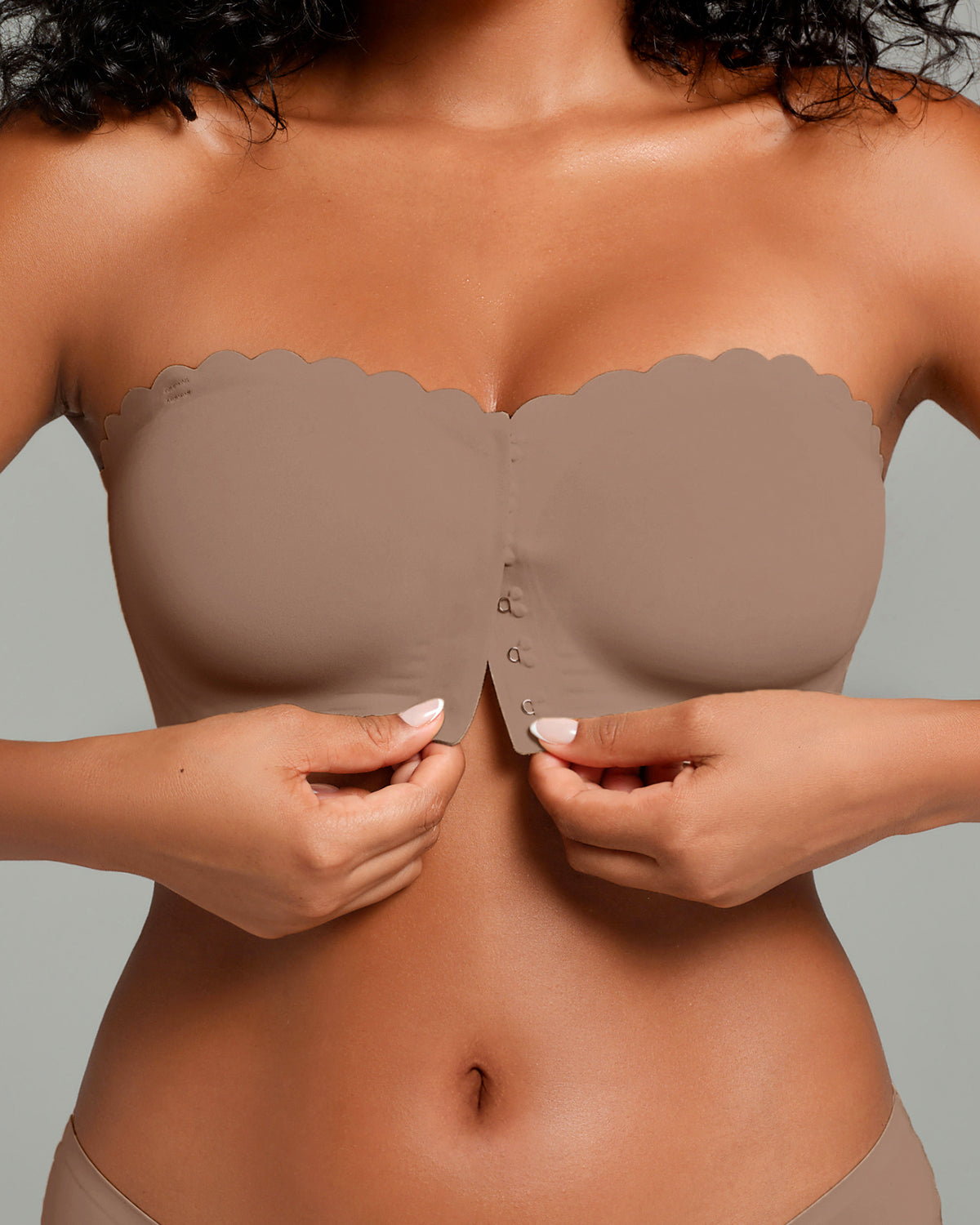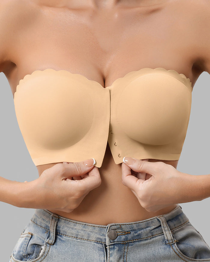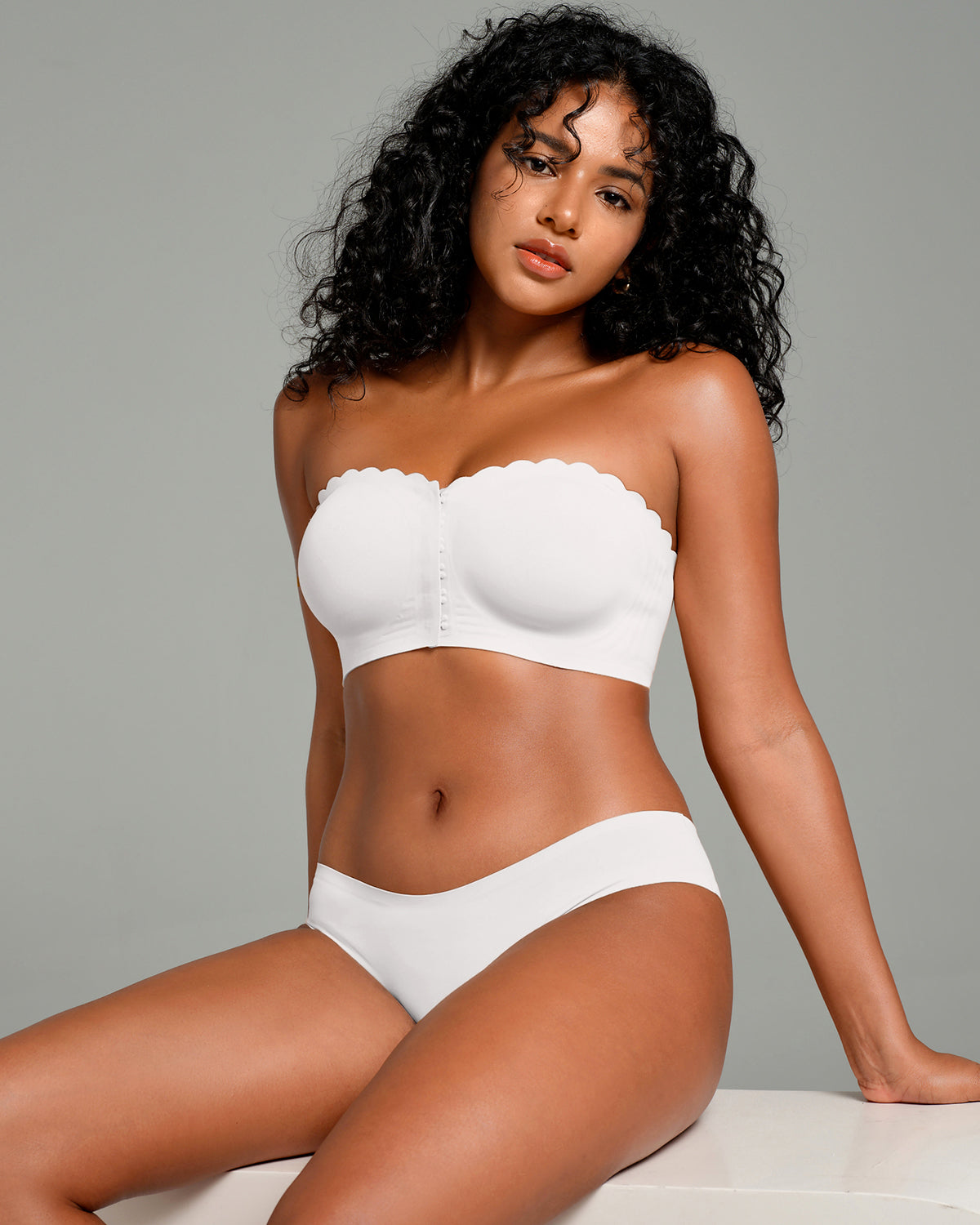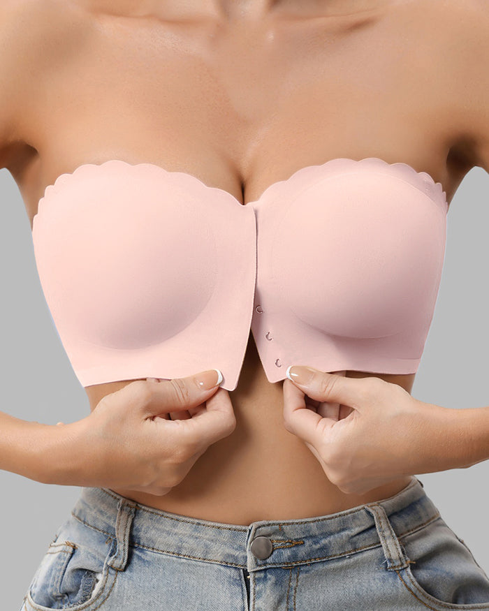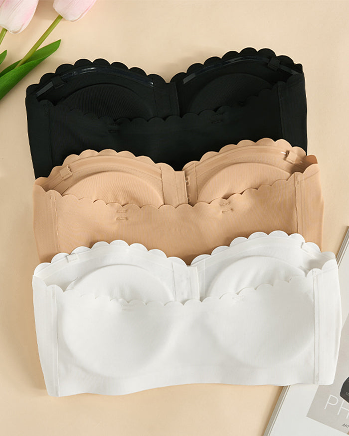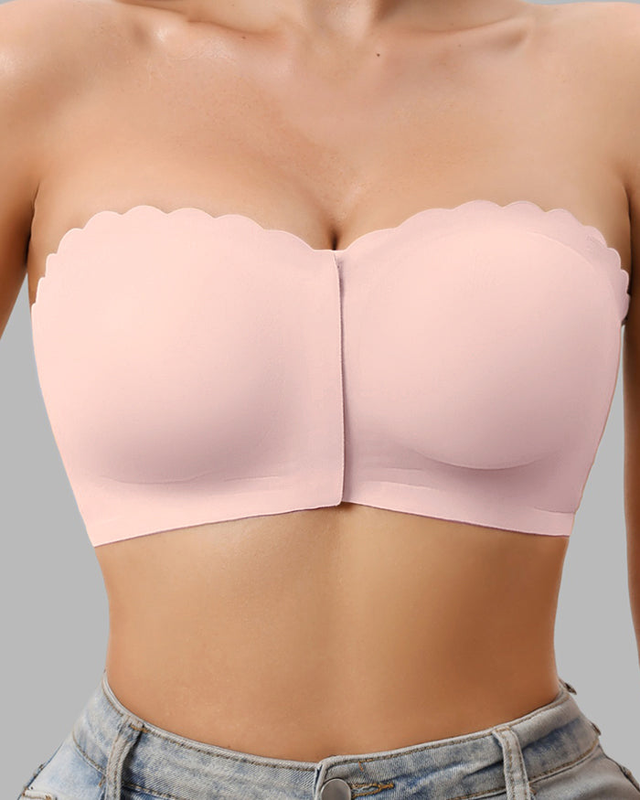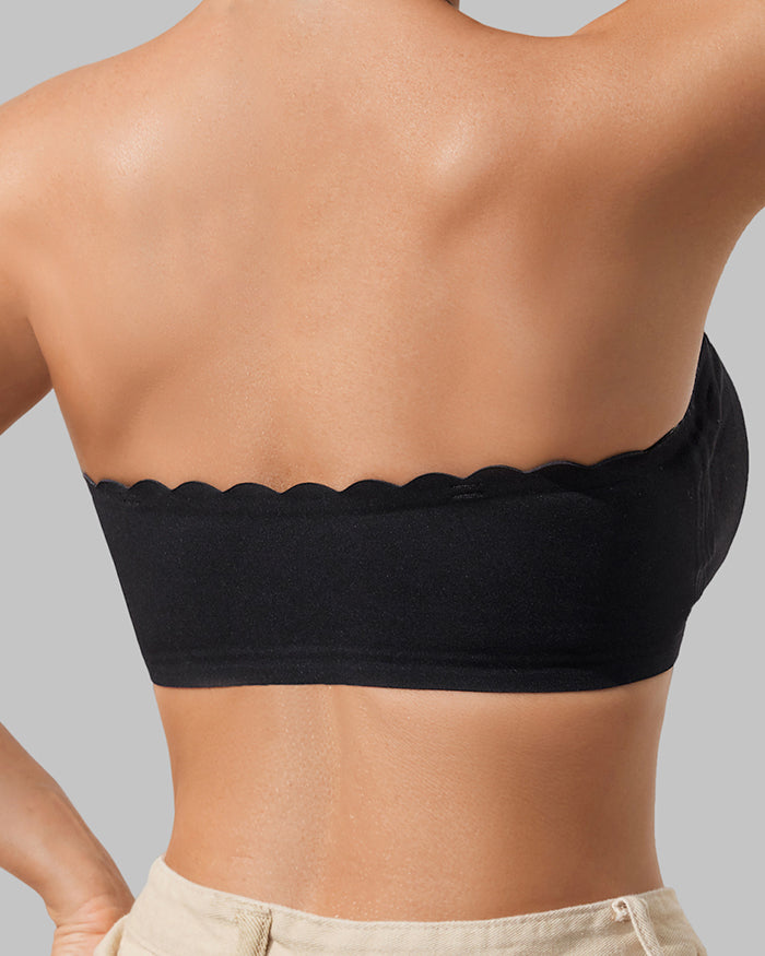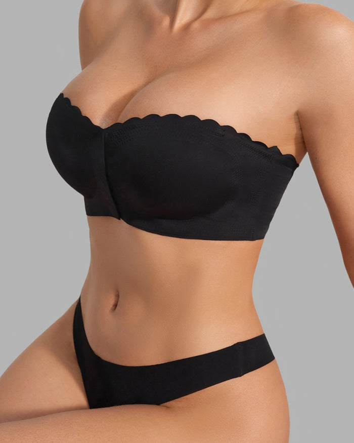 This bra features a convenient front closure for a hassle-free fit that reduces back strain. A non-slip silicone band ensures it stays securely in place. The wavy trim and strapless design beautifully showcase your shoulders and collarbones, making it stunningly sexy and appealing!