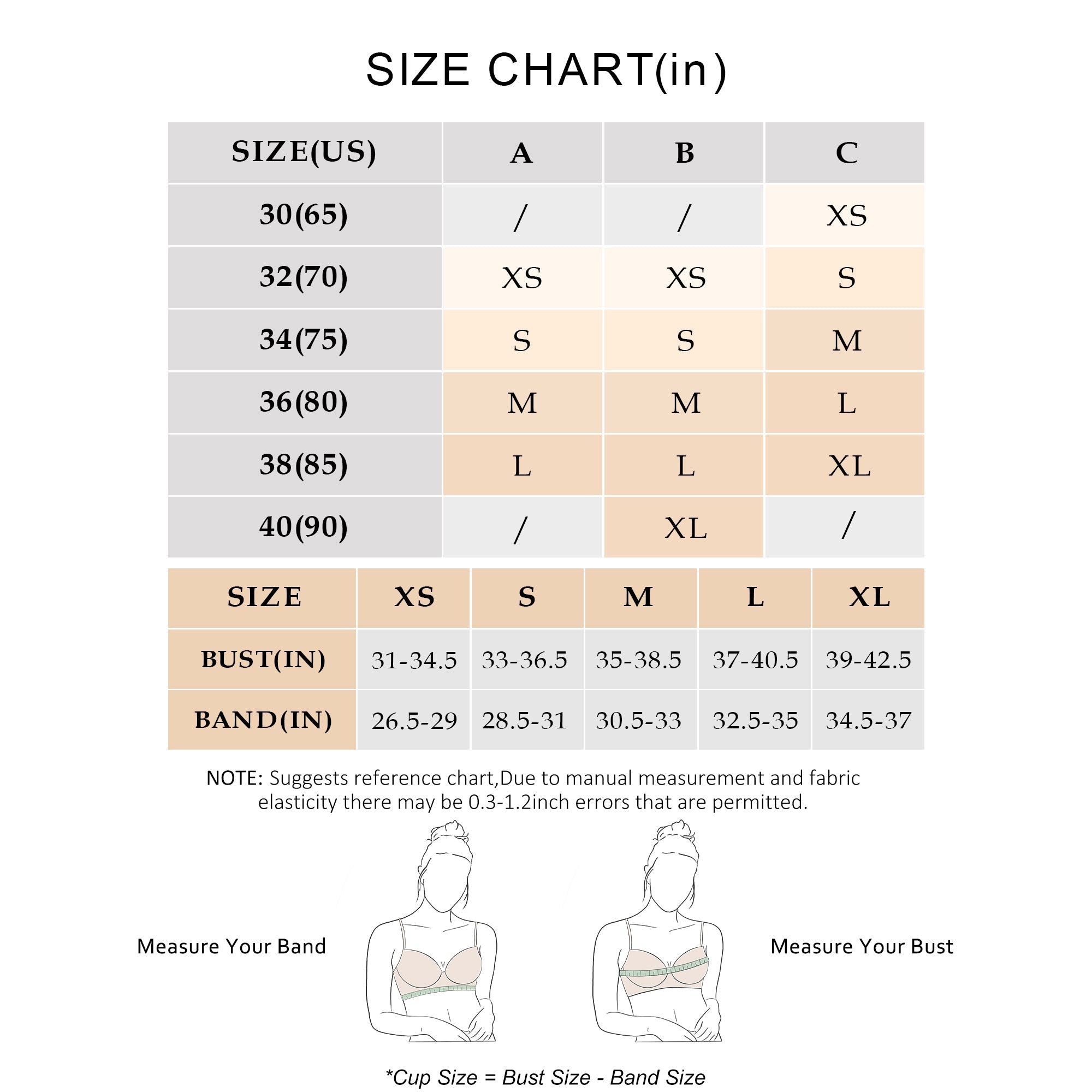 Example: If your bust size is 45'' and your band size is 42'', the cup size would be 45-42=3'', which will be a C cup.